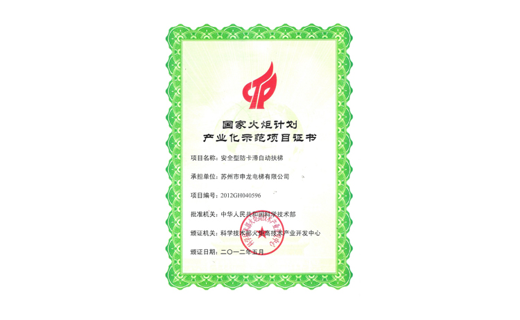國家火炬計劃產(chǎn)業(yè)化示范項目證書